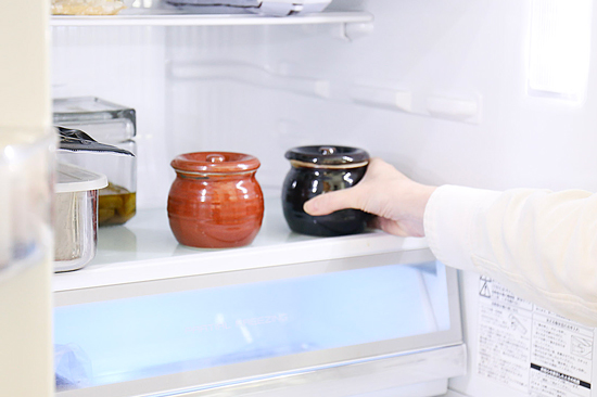 買ってきたお漬物や梅干しを甕へ詰め替えて冷蔵庫へ入れておけば、お食事の時は冷蔵庫から食卓へ運ぶだけなので、盛り付けの手間がいりません。
